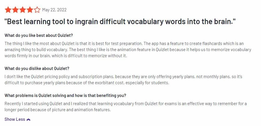 I don't like the Quizlet pricing policy and subscription plans, because they are only offering yearly plans, not monthly plans, so it's difficult to purchase yearly plans because of the exorbitant cost, especially for students.