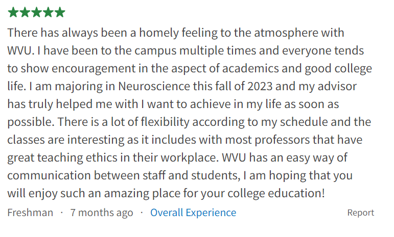 3- There has always been a homely feeling to the atmosphere with WVU. I have been to the campus multiple times and everyone tends to show encouragement in the aspect of academics and good college life. I am majoring in Neuroscience this fall of 2023 and my advisor has truly helped me with I want to achieve in my life as soon as possible. There is a lot of flexibility according to my schedule and the classes are interesting as it includes with most professors that have great teaching ethics in their workplace. WVU has an easy way of communication between staff and students, I am hoping that you will enjoy such an amazing place for your college education!