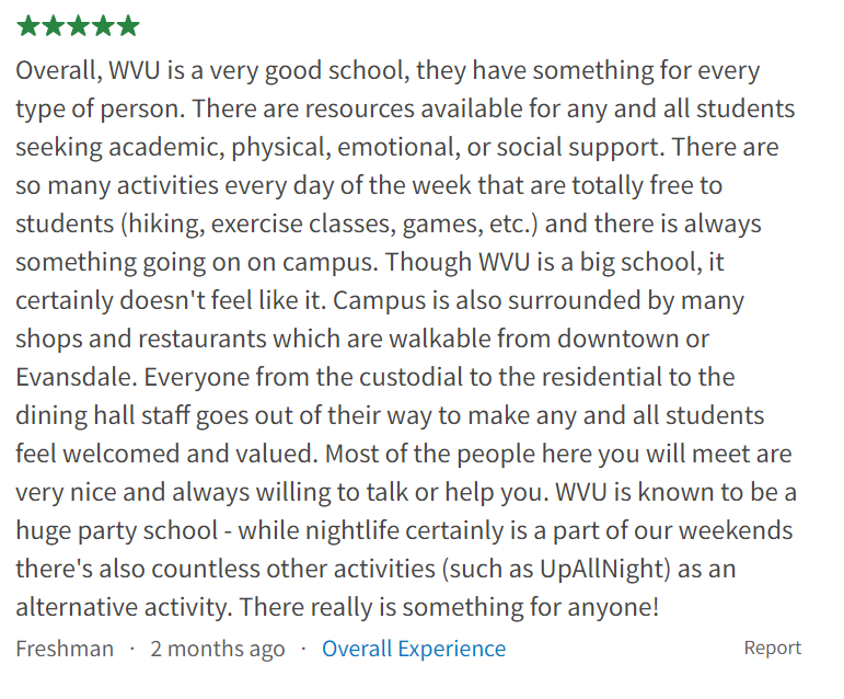 1- Overall, WVU is a very good school, they have something for every type of person. There are resources available for any and all students seeking academic, physical, emotional, or social support. There are so many activities every day of the week that are totally free to students (hiking, exercise classes, games, etc.) and there is always something going on on campus. Though WVU is a big school, it certainly doesn't feel like it. Campus is also surrounded by many shops and restaurants which are walkable from downtown or Evansdale. Everyone from the custodial to the residential to the dining hall staff goes out of their way to make any and all students feel welcomed and valued. Most of the people here you will meet are very nice and always willing to talk or help you. WVU is known to be a huge party school - while nightlife certainly is a part of our weekends there's also countless other activities (such as UpAllNight) as an alternative activity. There really is something for anyone!